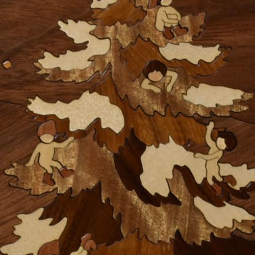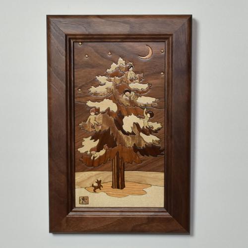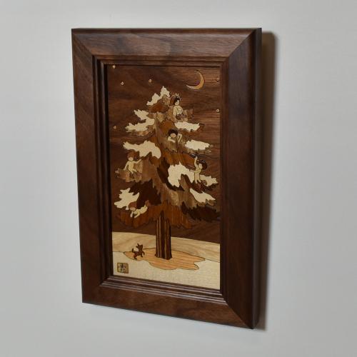 もみの木に集まった冬の精たち。話し声が聞こえてきそう、、、。樹種の違う木を使い、絵にした木象嵌ウッドアート作品。