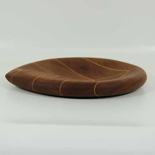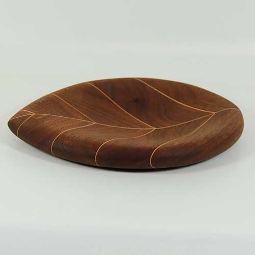 ウォールナットに白木をサンドして木の葉のデザインに削り上げたとても手の込んだ品です。ナッツやチーズなどおつまみを載せたり、お部屋のインテリアの一部にと、使う方のアイデアで用途は広がります。