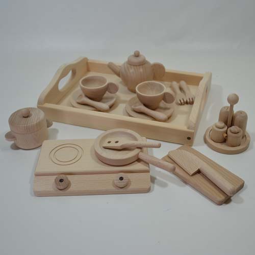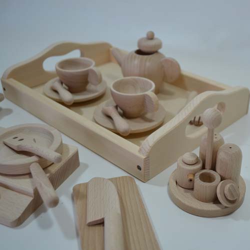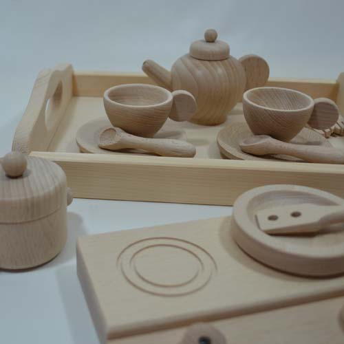 無塗装・無着色のブナの無垢材を使用して、日本の職人が器の内側までていねいに仕上げました。かわいいサイズのままごとです。