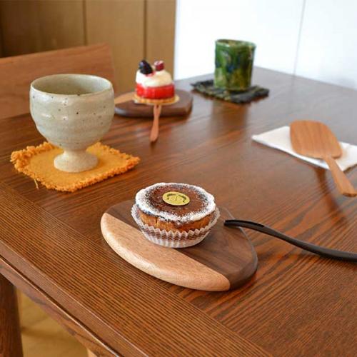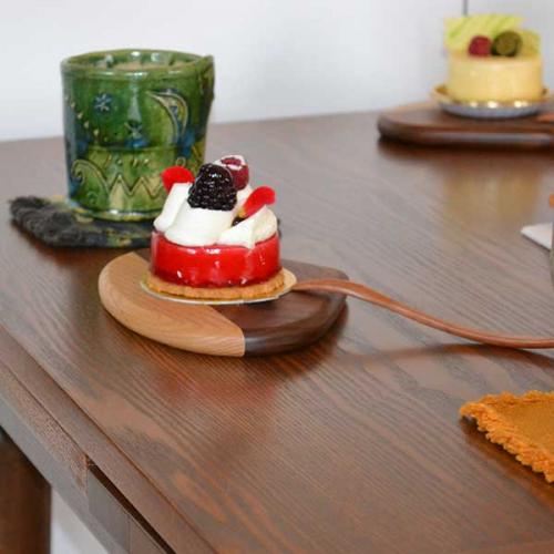 栗皮の色と似ているウォールナット材と白木のコントラストがとても良い感じにスイーツを引き立ててくれます。