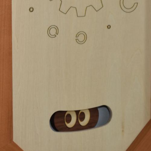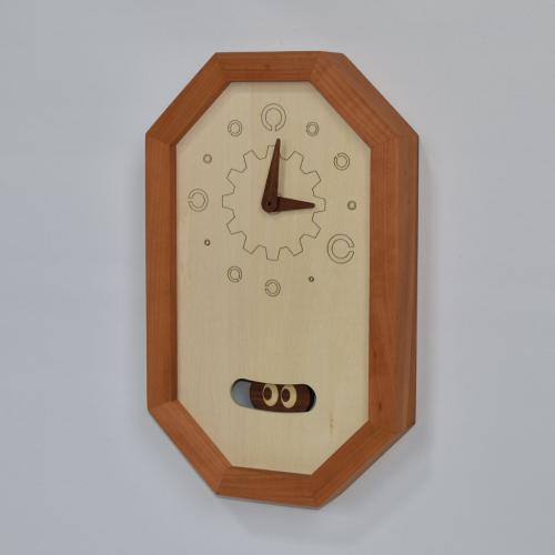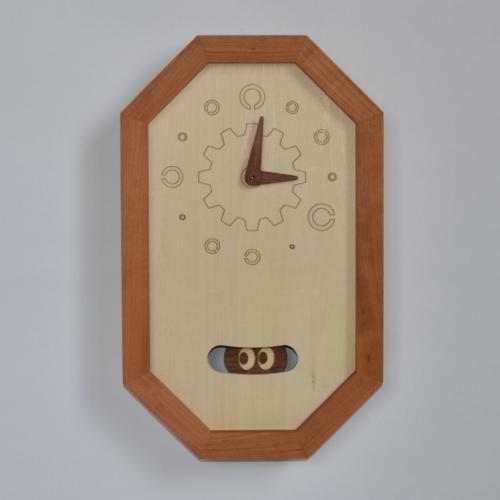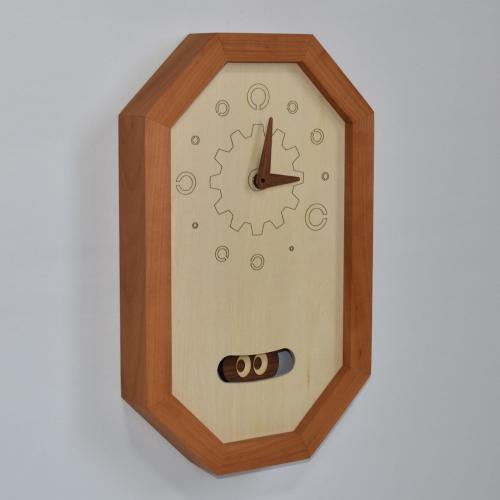 視力検査で使われているアルファベットのCのようなランドルト環マークをポイントにし、振り子もウォールナットに白木の目玉を付け、時計自体をユーモアあふれる作品にしてみました。