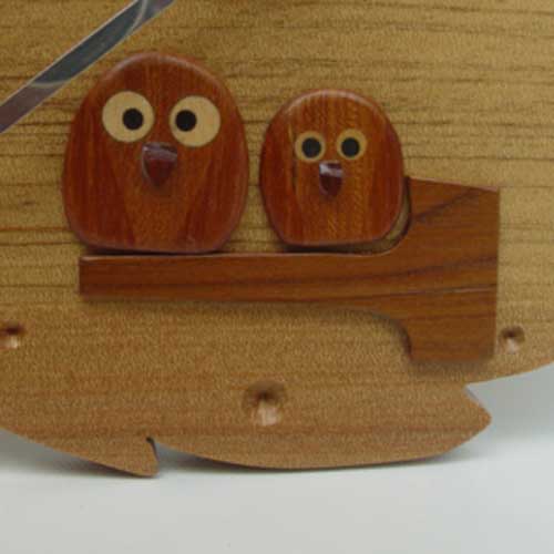 アガチスの無垢材を使った掛け時計。木の葉のベースにかわいい梟の親子がいいですね。フクロウは「不苦労」 「福来ろう」といわれる縁起の良い鳥です。こちらの商品は現品終了で製作中止です。